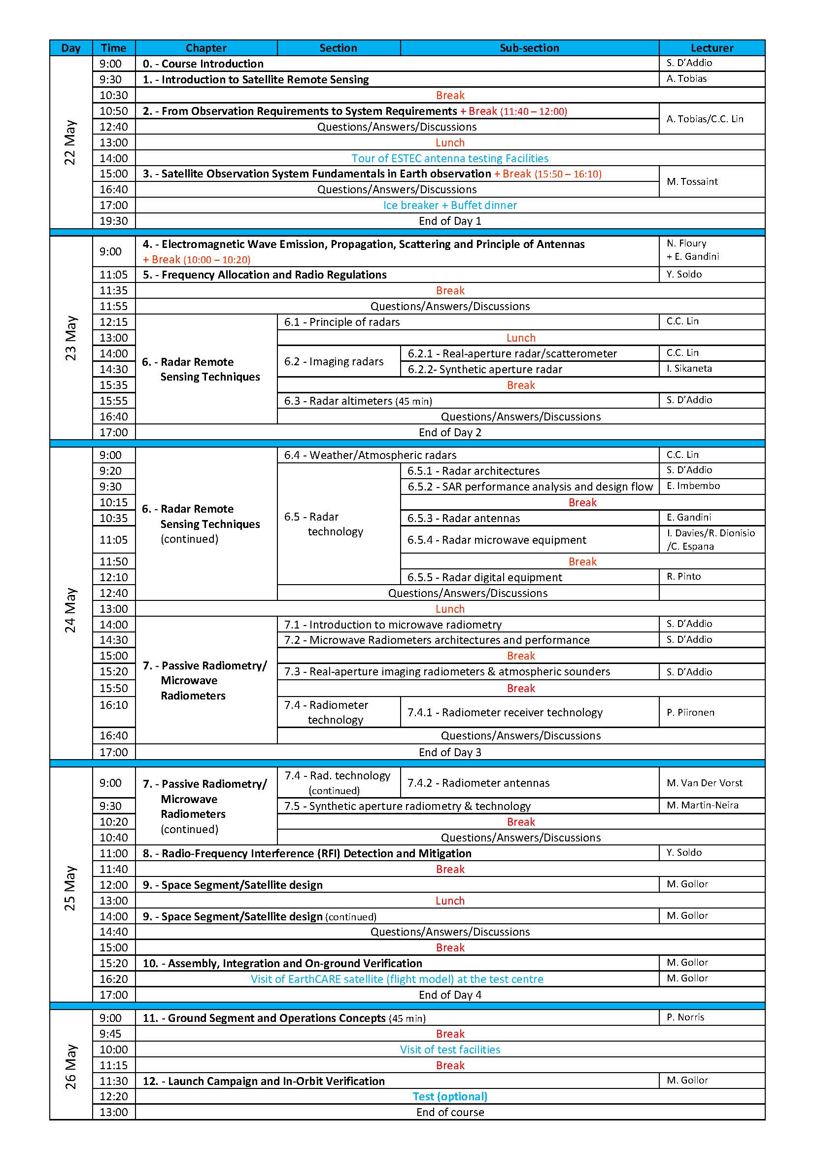 Lectures will be complemented with introductory as well as illustrative video presentations. On the 1st day, a tour of ESTEC and of microwave laboratories will be held. On the 5th day, the participants will be introduced to the satellite and equipment test facilities in connection to Lecture 10 (Assembly, Integration and On-Ground Verification).